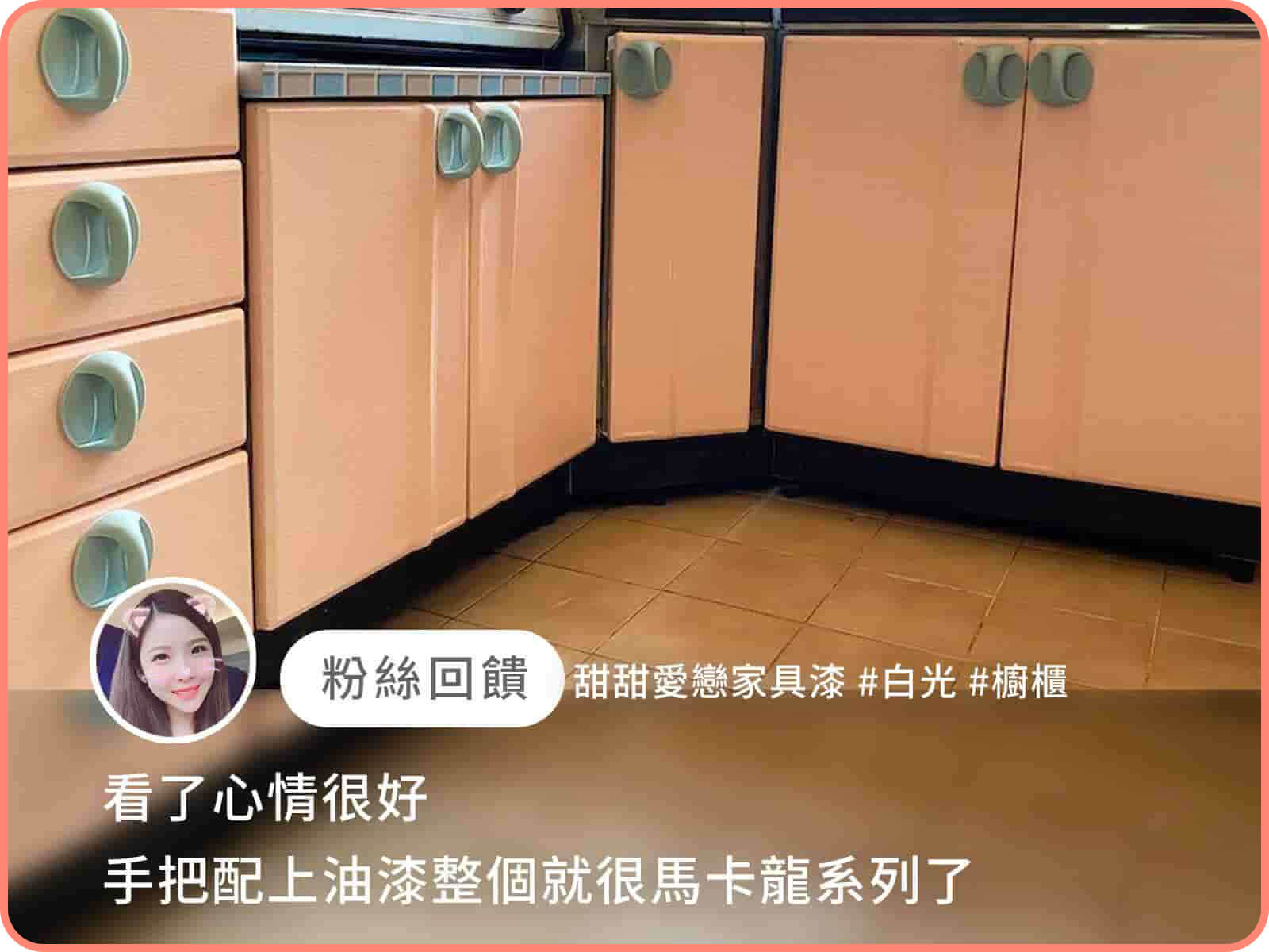 粉絲回饋 :看了心情很好,手把配上油漆整個就很馬卡龍系列了 改造空間:櫥櫃 環境光源:白光