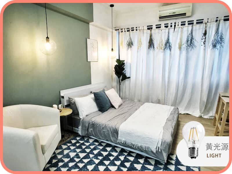 改造空間:臥室 改造好品:LED燈絲燈泡、dH風格油漆、比利時地毯 規格:6瓦E27(暖白)5顆