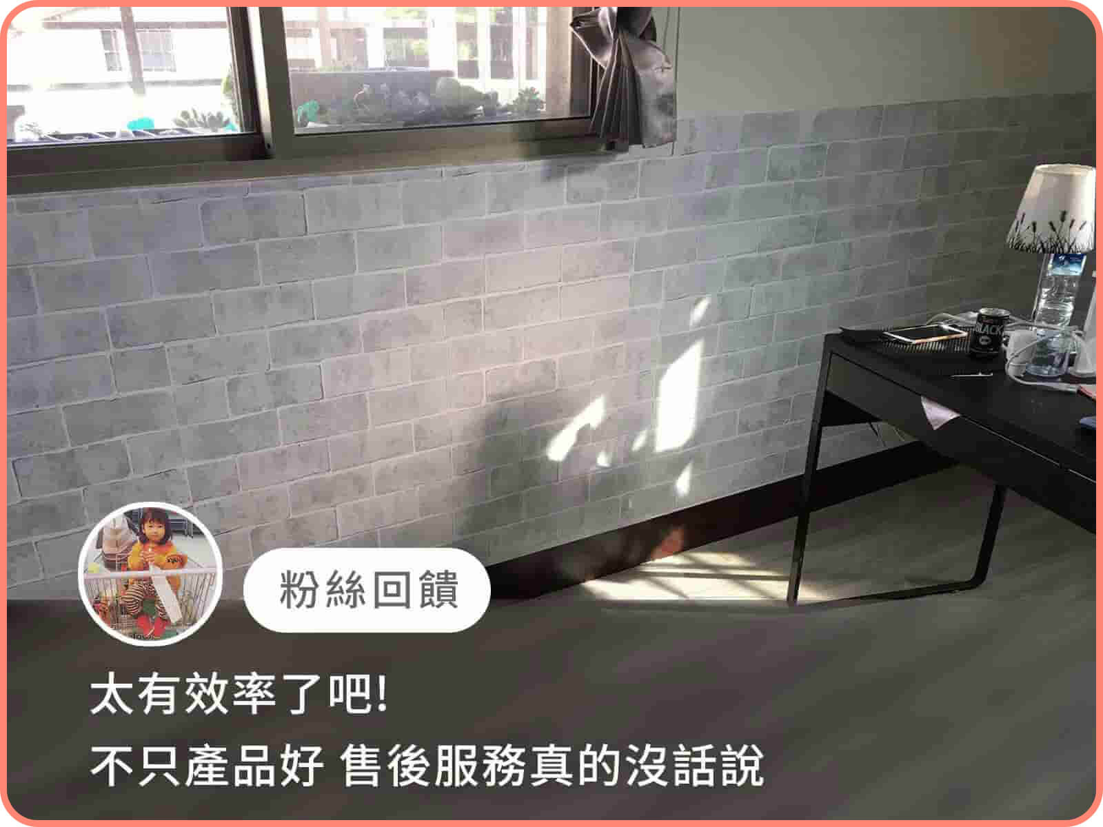 粉絲回饋照:「太有效率了吧!不只產品好 售後服務真的沒話說」 改造空間:工作空間改造光源:自然光改造好物:歐ㄋ一ˋ壁紙-工業灰磚