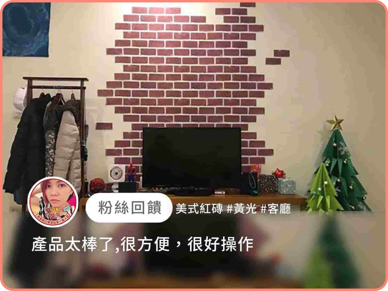粉絲回饋照:「產品太棒了,很方便,很好操作」 改造空間:客廳改造光源:黃光改造好物:歐ㄋ一ˋ壁紙-美式紅磚