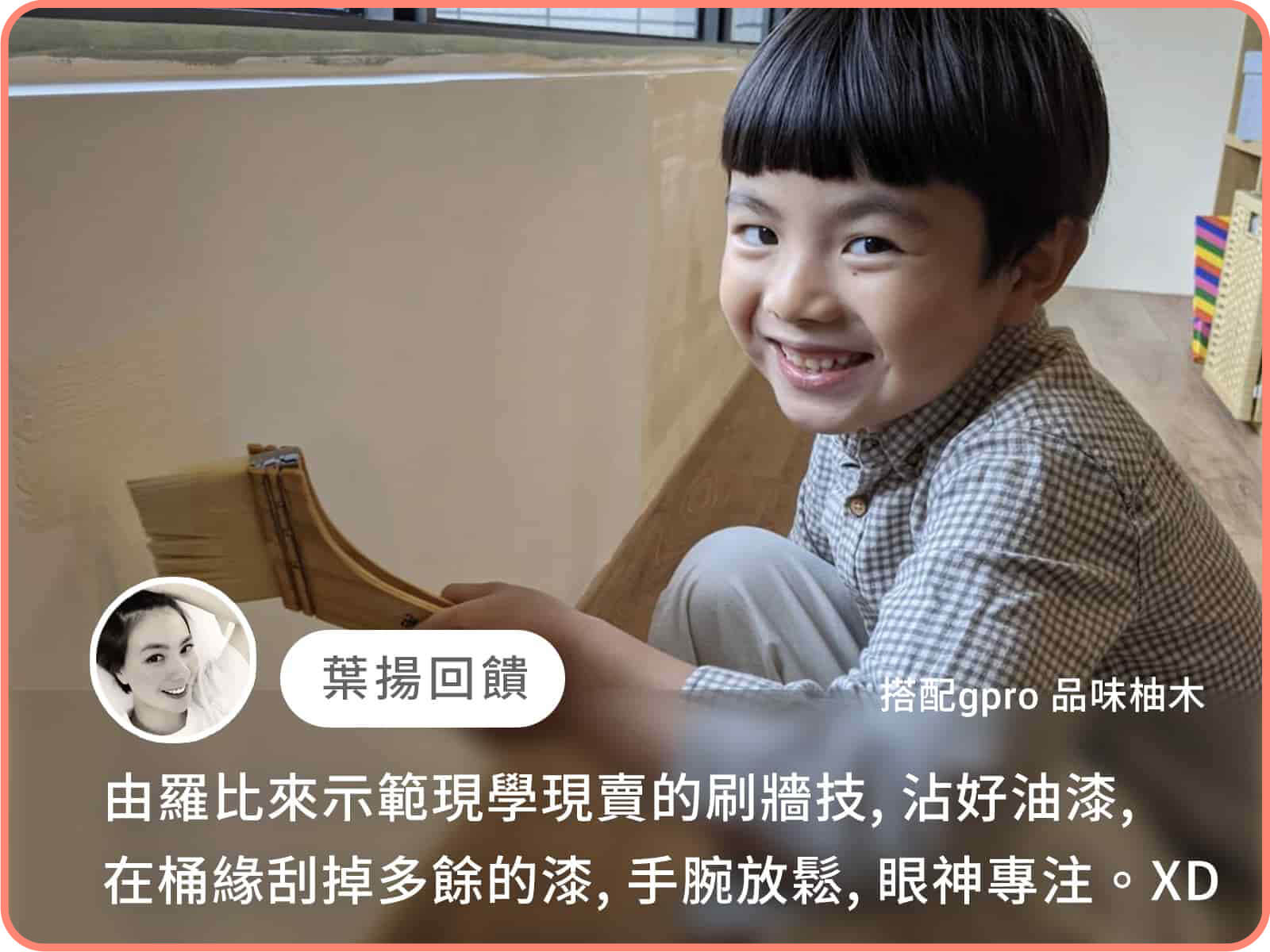 作家葉揚:『由羅比來示範現學現賣的刷牆技,沾好油漆,在桶邊刮掉多餘的漆,手腕放鬆,眼神專注。XD』