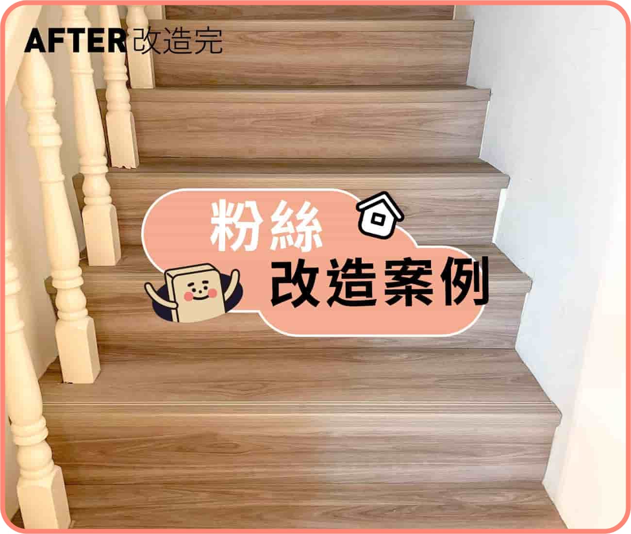 d粉需求 『家裡的樓梯磁磚實在是有點滑,小孩子或者長輩在上面走都很怕他們跌倒。 但因為房子有點年紀,樓梯梯面不是很平整,一直想改造又一直找不到適合的地板, 同時只鋪設梯面,立面不改又覺得怪。』.....
