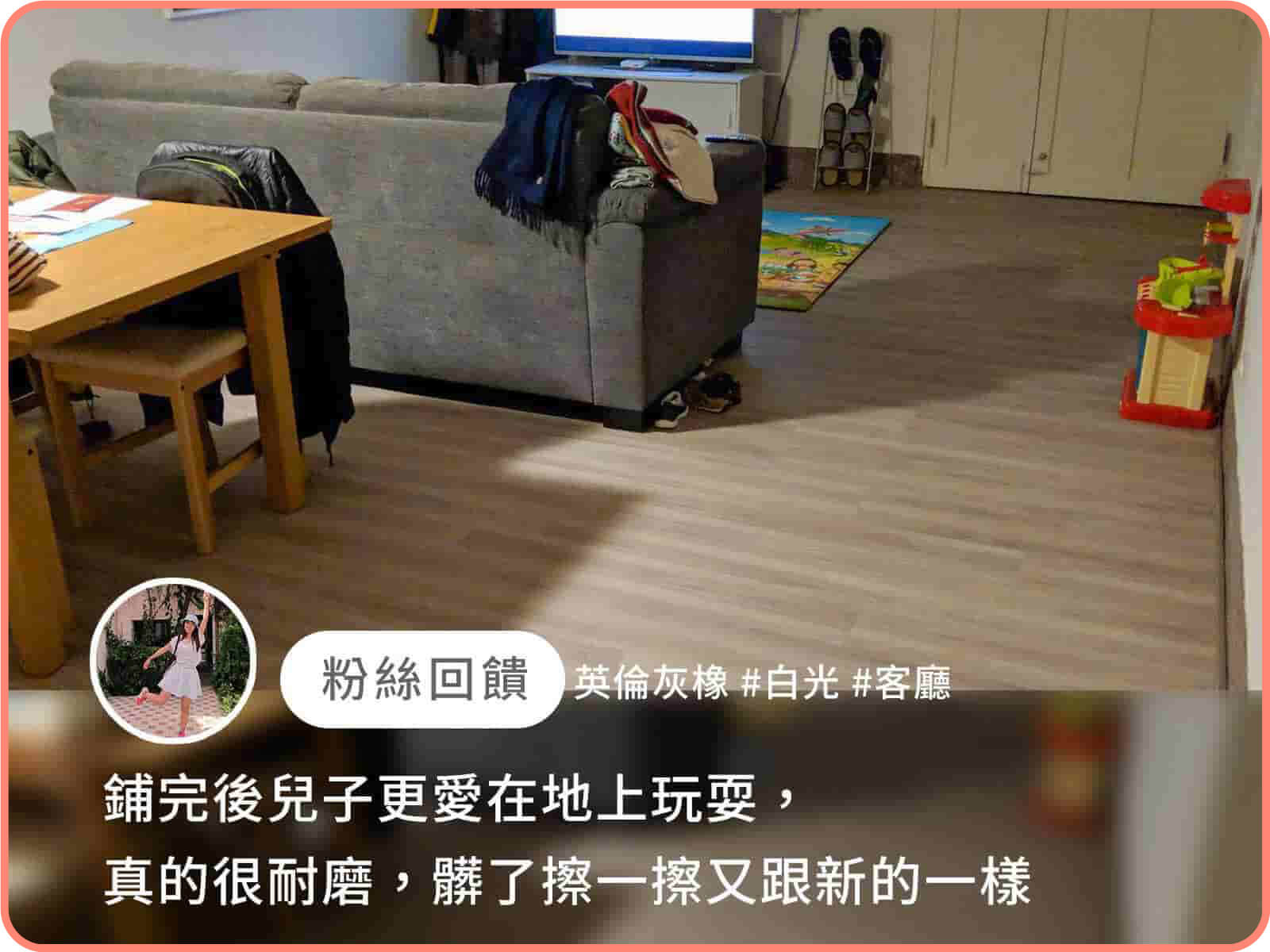 粉絲回饋:「鋪完後兒子更愛在地上玩耍,真的很耐磨,髒了擦一擦又跟新的一樣。」